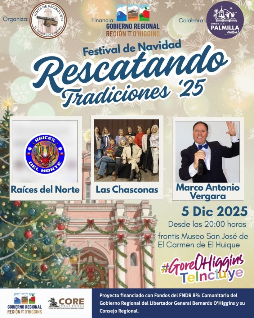 ¡Te invitamos a vivir una noche mágica en El Huique! ✨Celebremos juntos nuestras raíces, la cultura local y el espíritu navideño que nos une como comunidad. Frontis del Museo San José del Carmen de El Huique️ Próximamente — desde las 20:00 hrs. PROGRAMA 20:00 — Inauguración oficial del evento…